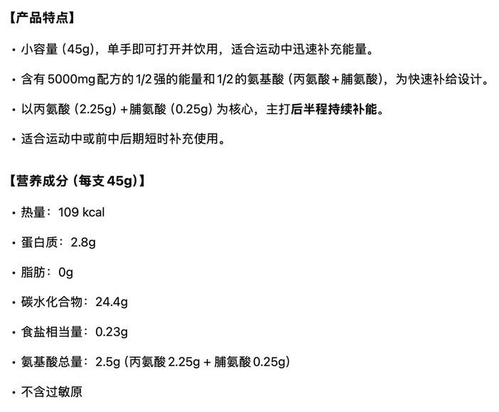 产品特点:包含的氨基酸每支为2500mg,丙氨酸,脯氨酸和糖分混合的小容量果冻。